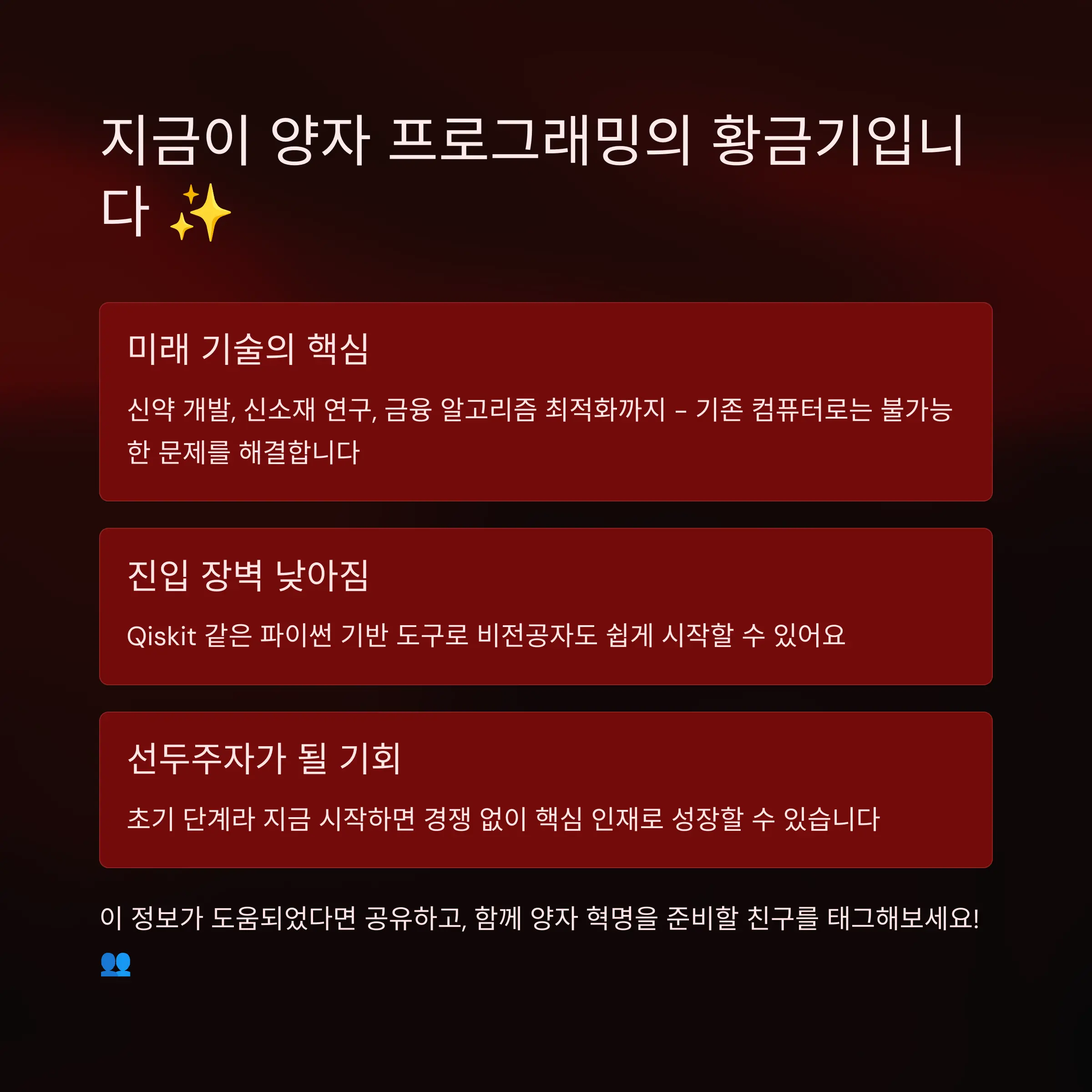모든 기술이 그렇듯, 양자 프로그래밍도 시작이 어렵고, 낯설어요. 하지만 가장 중요한 건 “지금 내가 관심을 갖고 있다”는 사실입니다. 그것만으로도 이미 첫 단계를 넘은 거예요. 우리는 늘 너무 빠르거나 너무 늦다고 생각하지만, 실제로는 대부분 ‘적절한 타이밍’을 그냥 놓치고 있었을 뿐이죠.