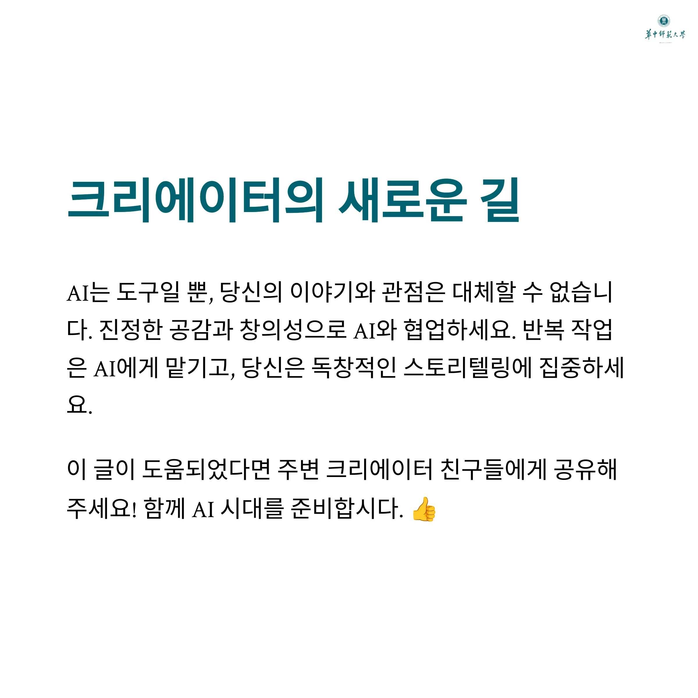 지금은 누구나 AI를 이용해 콘텐츠를 만들 수 있는 시대예요. 하지만 진짜 중요한 건 "그 콘텐츠를 왜 만들었는가", "누구에게 어떤 감정을 주었는가"예요. 이건 AI가 절대 따라올 수 없는 영역이죠. 그래서 이제 우리는, 단순히 만들 줄 아는 사람이 아니라, 의미를 전달할 줄 아는 크리에이터가 되어야 해요. 그게 우리가 지켜야 할 진짜 경쟁력입니다.